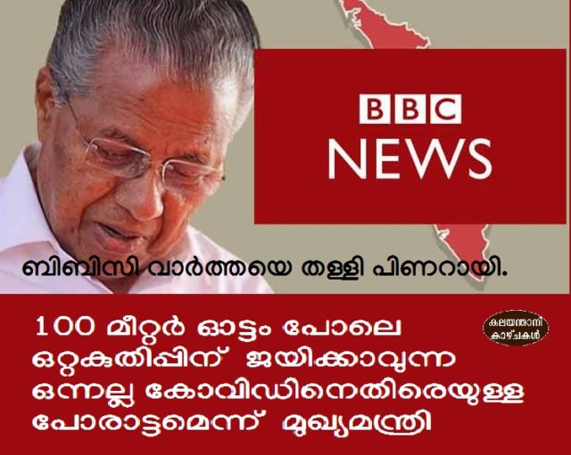 അതേസമയം കോവിഡിനെതിരായ പോരാട്ടം 100 -200 മീറ്റര് ഓട്ടം പോലെ ഒറ്റയടിക്ക് ഓടി ജയിക്കാവുന്ന ഒന്നല്ലെന്നു മുഖ്യമന്ത്രി പിണറായി വിജയന് പറഞ്ഞു . കോവിഡ് പ്രതിരോധകാര്യത്തില് കേരളത്തിന്റേത് അപക്വമായ ആഘോഷമായിരുന്നുവെന്നു ബി.ബി.സി. വിമര്ശിച്ചല്ലോയെന്ന ചോദ്യത്തിനു മറുപടി പറയുകയായിരുന്നു മുഖ്യമന്ത്രി. ഇതില് ആരോഗ്യ സംവിധാനത്തിന്റെ മാത്രമല്ല, പൊതുസമൂഹത്തിന്റെയും ക്ഷമയും സഹനശക്തിയും പരീക്ഷിക്കപ്പെടുകയാണെന്നും മുഖ്യമന്ത്രി പറഞ്ഞു. പ്രതിസന്ധിയെ അതിജീവിക്കാനുള്ള ശാരീരികക്ഷമത ഉറപ്പുവരുത്തുന്നതിനൊപ്പം അവസാനം വരെയും പോരാടാനുള്ള മാനസികമായ കരുത്ത് കൂടിയാണ് നമുക്കിപ്പോള് ആവശ്യം. ഇപ്പോള് ഇതുയര്ത്തിക്കാട്ടി സര്ക്കാരിനെതിരേ വരുന്നവര് നേരത്തേ പറഞ്ഞത് സര്ക്കാരിന്റെ പി.ആര് വര്ക്ക് കൊണ്ടാണ് ബി.ബി.സി ആദ്യമെഴുതിയത് എന്നാണ്. ഇപ്പോള് കേരളത്തിനെന്തോ തിരിച്ചടി കിട്ടിയെന്ന തരത്തില് അവരുടെ വാര്ത്തയെ അതേ ആളുകള് സമീപിക്കുകയാണ്. എന്നാല്, ഇപ്പോഴവര് പറയുന്ന പുതിയ വാര്ത്തയിലും ബി.ബി.സി പറയുന്നത്, കേരളം ഇതിനെ നന്നായി കൈകാര്യം ചെയ്തു എന്നാണ്.