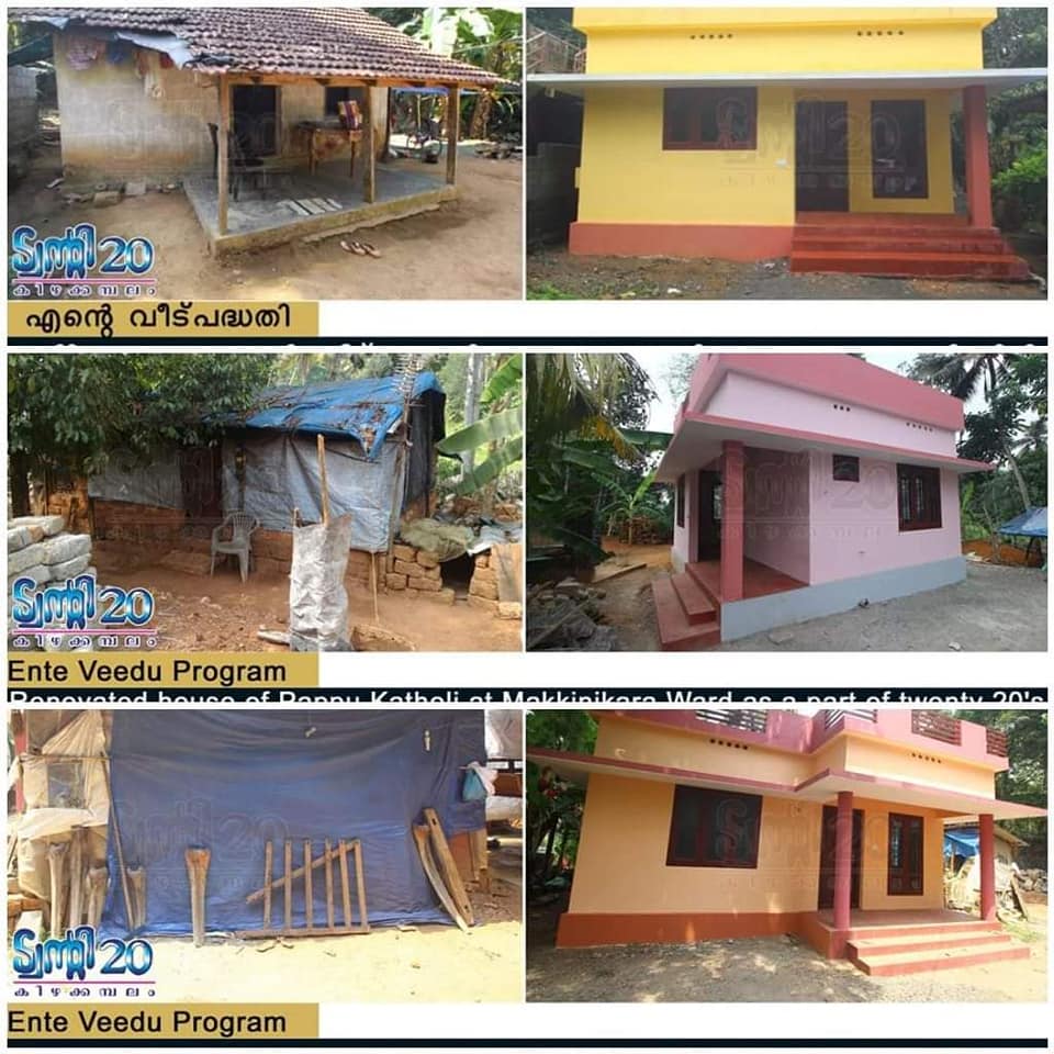 കിഴക്കമ്പലം പഞ്ചായത്തില് ഒത്തിരിആളുകൾ ശോചനീയ അവസ്ഥയിലാണ് ജീവിച്ചു പോന്നിരുന്നത്. ടാര്പോളീന് വലിച്ചു കെട്ടിയതും ഏതു നിമിഷവും തകര്ന്നുവീഴാവുന്ന ചുമരുകള് ഉള്ളതും വാതിലുകളോ ജനലുകളോ ഇല്ലാതെ , ഒരു വീടിന്റെ സുരക്ഷിതത്വം ഒട്ടും തന്നെയില്ലാത്ത കൂരകളിൽ ജീവിച്ചു പോന്ന നിരവധി പേര്. ഈയൊരു സാഹചര്യത്തിലാണ് ട്വന്റി-ട്വന്റി കിഴക്കമ്പലം എന്ന പ്രസ്ഥാനം അവിടേയ്ക്ക് കടന്നു വരുന്നത്. അതോടെ കിഴക്കമ്പലത്തിന്റെ മുഖഛായ മാറി . എല്ലാവര്ക്കും സുരക്ഷിതമായ താമസസ്ഥലം എന്ന കാഴ്ച്ചപ്പാടിൽ എന്റെ വീട് എന്ന പദ്ധതിക്കു അവർ രൂപം നൽകി . ഈ പദ്ധതിയുടെ കീഴില്കിഴക്കമ്പലത്ത് 530 വീടുകള് പുതുതായി നിര്മിച്ചു. 970 വീടുകൾ പുനരുദ്ധാരണം ചെയ്തു.