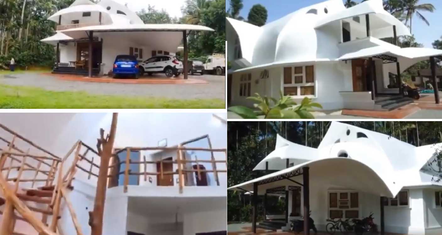 മകുടം പോലെ മേൽക്കൂര വരുന്ന രീതിയിലാണ് വീടിന്റെ ഡിസൈൻ. ഭിത്തി മുകളിലേക്ക് വരുമ്പോൾ മേൽക്കൂരയായി മാറുന്നു . ഭിത്തിയും സീലിങ്ങും ഉറപ്പിക്കാൻ വളരെ കുറച്ചു കമ്പിയേ ഉപയോഗിച്ചിട്ടുള്ളൂ. ഭിത്തിയിൽ കനംകുറച്ച് സിമന്റ് പ്ലാസ്റ്ററിങ്ങും ചെയ്തിട്ടുണ്ട്.