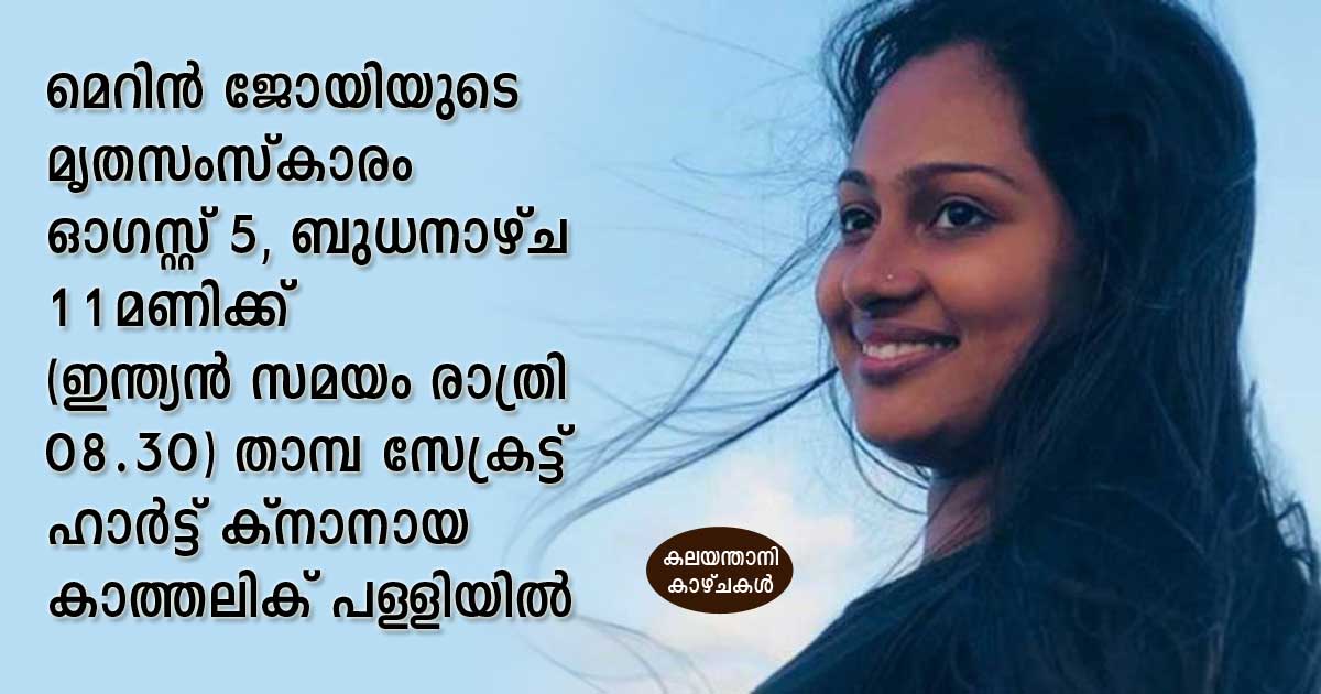 ഫ്ലോറിഡ : അമേരിക്കയില് ഭർത്താവിന്റെ കുത്തേറ്റ് മരിച്ച മലയാളി നേഴ്സ് മെറിന് ജോയിയുടെ സംസ്കാരം ഇന്ന് റ്റാംപയിലെ സേക്രഡ് ഹാർട്ട് ക്നാനായ കാത്തലിക് പള്ളിയിൽ നടക്കും. അമേരിക്കൻ സമയം രാവിലെ 10 മുതൽ 11 വരെ (ഇന്ത്യൻ സമയം രാത്രി 7.30 മുതൽ 8.30 വരെ) പള്ളിയിൽ പൊതുദർശനം. 11 മുതൽ സംസ്കാര ശുശ്രൂഷകൾ ആരംഭിക്കും. ഫാ.ജോസ് ആദോപ്പള്ളിൽ കാർമികത്വം വഹിക്കും. തുടർന്ന് ഉച്ചയ്ക്ക് 2നു (ഇന്ത്യൻ സമയം രാത്രി 11:30) ഹിൽസ്ബൊറൊ മെമ്മോറിയൽ സെമിത്തേരിയിൽ സംസ്കാരം നടക്കും. ചടങ്ങുകള് ലൈവായി സംപ്രേഷണം ചെയ്യുന്നുണ്ട്.