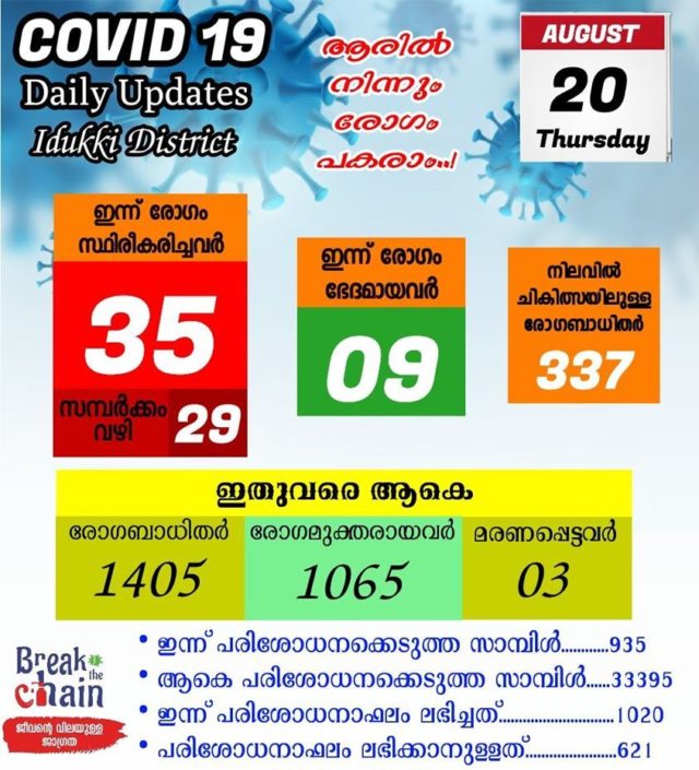 ഇതോടെ ഇടുക്കി സ്വദേശികളായ 337 പേരാണ് നിലവിൽ കോവിഡ് 19 സ്ഥിരീകരിച്ച് ചികിത്സയിലുള്ളത്