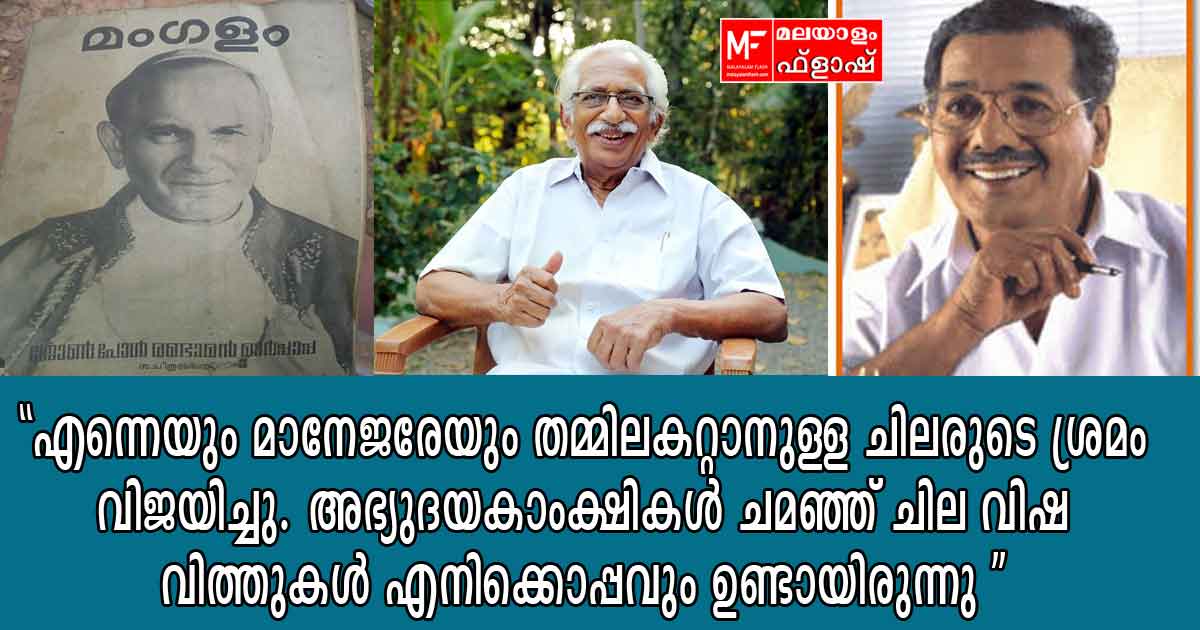 പലരും പലപ്പോഴും ചോദിച്ചിട്ടുണ്ട്; ഞാൻ മംഗളത്തിൽ നിന്നും പിരിയാണുണ്ടായ കാരണം. ഞങ്ങളുടെ പൊതു സുഹൃത്തുക്കൾക്ക് അവിശ്വസനീയമായിരുന്നു ആ വേർപിരിയൽ. പക്ഷേ അത് സംഭവിച്ചു. മംഗളത്തിന്റെ പുഷ്കല കാലത്താണ് അതുണ്ടായത് എന്നതാണ് ഏറെ ശ്രദ്ധേയം. അതേക്കുറിച്ച് പറയും മുൻപ് മംഗളത്തിന്റെ തുടക്കത്തെക്കുറിച്ച് പറയേണ്ടതുണ്ട്.