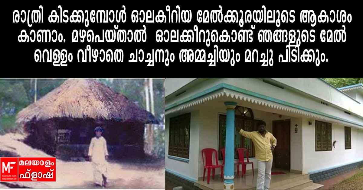 ”രാത്രി വീടിനകത്ത് കിടക്കുമ്പോൾ ഓല കീറിയ മേൽക്കൂരയിലൂടെ ആകാശം കാണും. മഞ്ഞുകാലം ആയാൽ വീടിനകത്തേക്ക് മഞ്ഞ് ഒഴുകിയിറങ്ങുന്ന അനുഭവം. പക്ഷേ മഴക്കാലം ഇത്തിരി കഷ്ടപ്പാടാണ്. മഴയത്തു ചൂടുന്ന ഓലകൊണ്ട് ഞങ്ങളുടെ മേൽ വെള്ളം വീഴാതെ ചാച്ചനും അമ്മച്ചിയും മറച്ചു പിടിക്കും. ഇതൊക്കെ എനിക്ക് എങ്ങനെ മറക്കാൻ കഴിയും?”