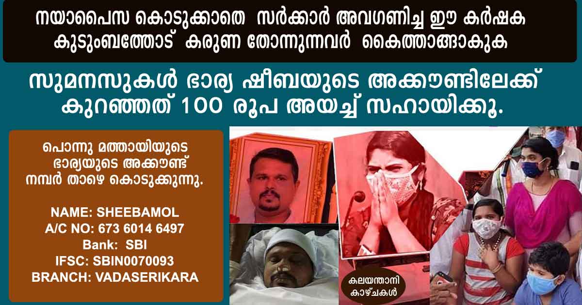 ഭർത്താവിന്റെ മരണത്തോടെ ഷീബയുടെ കുടുംബം നിത്യദുഖത്തിന്റെ ആഴക്കയത്തിലേക്ക് വീണിരിക്കയാണ്. എന്തുവന്നാലും തിരിഞ്ഞുനോക്കില്ലെന്ന നിലപാടിൽ ഉറച്ചു സർക്കാരും. ഈ സാഹചര്യത്തിൽ ഈ കുടുംബത്തെ സഹായിക്കാൻ സന്മനസുള്ളവർ മുൻപോട്ട് വരിക .