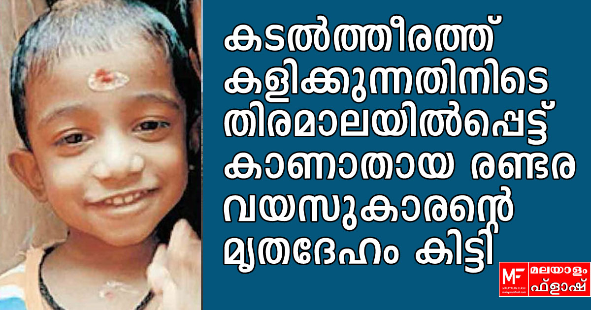 ആലപ്പുഴ: കടൽത്തീരത്ത് കളിക്കുന്നതിനിടെ തിരമാലയിൽപ്പെട്ട് കാണാതായ രണ്ടര വയസുകാരന്റെ മൃതദേഹം കിട്ടി . പാലക്കാട് കിഴക്കഞ്ചേരി കൊഴുക്കുള്ളി ലക്ഷ്മണൻ അനിതമോൾ ദമ്പതികളുടെ ഇളയ മകൻ ആദികൃഷ്ണയുടെ മൃതദേഹം ആണ് കിട്ടിയത്. ആലപ്പുഴ ഇഎസ്ഐ ജങ്ഷന് സമീപം 13 ന് ഉച്ചയ്ക്ക് രണ്ടരയോടെ ആയിരുന്നു സംഭവം .