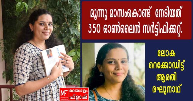 ഈ ലോക്ഡൗൺ കാലത്ത് മൂന്നു മാസം കൊണ്ട് ആരതി പഠിച്ചു നേടിയത് 350 ഓൺലൈൻ കോഴ്സ് സർട്ടിഫിക്കറ്റുകളാണ്. ഒപ്പം ഒരു ലോക റെക്കോഡും അടിച്ചെടുത്തു . യൂണിവേഴ്സൽ റെക്കോഡ് ഫോറത്തിന്റെ ഏഷ്യൻ വേൾഡ് റെക്കോഡ് .
