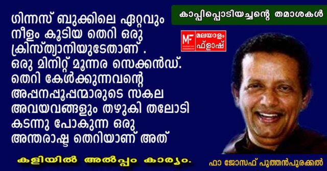 ഗിന്നസ് ബുക്കിലെ ഏറ്റവും നീളം കൂടിയ തെറി ഒരു ക്രിസ്ത്യാനിയുടേതാണ്. കാസർകോടുള്ള ഒരു സീറോമലബാർ കുടുംബനാഥന്റെ തെറി. ഒരു മിനിറ്റ് മൂന്നര സെക്കൻഡാണ് ദൈർഘ്യം. ആ തെറിയുടെ സാരാംശം എന്താണ് ? ആരെ തെറിവിളിച്ചോ അവന്റെ അപ്പനപ്പൂപ്പന്മാരുടെ സകല അവയവങ്ങളും തഴുകി തലോടി കടന്നു പോകുന്ന ഒരു അന്തരാഷ്ട തെറി. ഇവിടെയാണ് പറയുക കുടുംബം ഒരു ചന്ത ആകരുത് എന്ന് . നമ്മുടെയൊക്കെ മാതൃകകൾ എല്ലാവരും നോക്കി പഠിക്കും.