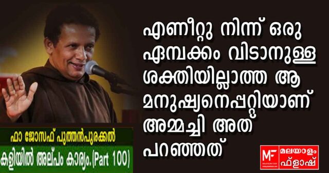 ഒരിക്കൽ 75 വയസുള്ള ഒരു സ്ത്രീ ധ്യാനത്തിന് വന്നപ്പോൾ എന്നോട് പറഞ്ഞു : ”എന്റെ അച്ചാ എന്റെ കെട്ടിയവന് വയസ് 80. എൺപതു വയസായെങ്കിലും ഇപ്പോഴും വേലക്കാരി വെള്ളം കൊണ്ട് പോകുമ്പോൾ പുള്ളിക്കാരൻ എത്തിപ്പിടിച്ചൊരു നോട്ടമാണ് . ” അച്ചൻ ഒന്ന് ഉപദേശിക്കണമെന്ന് അവർ പറഞ്ഞു.