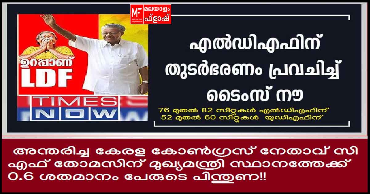 തിരുവനന്തപുരം: കേരളത്തിൽ 76 മുതൽ 82 സീറ്റുകൾ വരെ നേടി ഇടതുമുന്നണി അധികാരത്തിൽ വരുമെന്ന് ടൈംസ് നൗ- സീ വോട്ടർ സർവ്വേ. 52 മുതൽ 60 സീറ്റുകൾ വരെയാണ് യുഡിഎഫിന് ലഭിക്കുകയെന്നും സർവ്വേ പ്രവചിക്കുന്നു. രണ്ട് സീറ്റുകൾ വരെ ബിജെപി വിജയിച്ചേക്കാമെന്നും പ്രവചിക്കുന്നു.