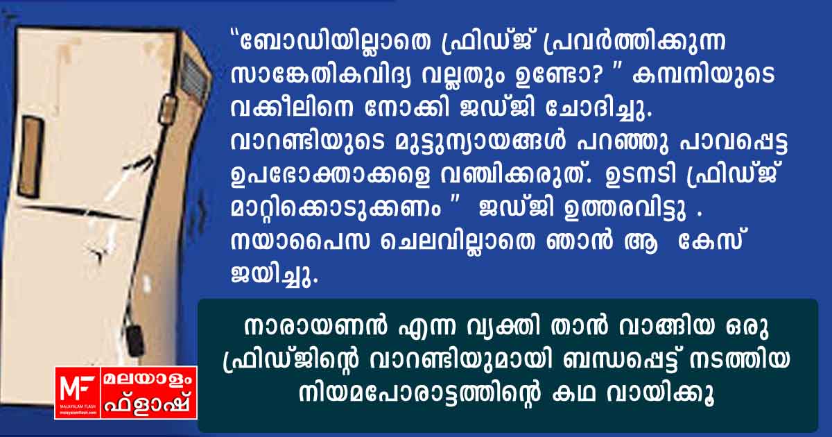 നാരായണൻ ഇ എന്ന വ്യക്തി താൻ വാങ്ങിയ ഒരു ഫ്രിഡ്ജിന്റെ വാറണ്ടിയുമായി ബന്ധപ്പെട്ട് നടത്തിയ നിയമപോരാട്ടത്തിന്റെ കഥ സോഷ്യൽ മീഡിയയിൽ പങ്കുവച്ചത് വൈറലായി . നാരായണന്റെ കുറിപ്പ് ഇങ്ങനെ