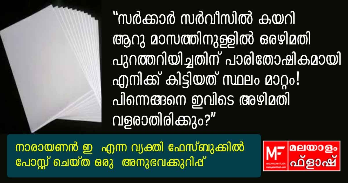 സർക്കാർ സർവീസിൽ കയറി ആറു മാസത്തിനുള്ളിൽ ഒരഴിമതി പുറത്തറിയിച്ചതിന് എനിക്ക് പാരിതോഷികമായി കിട്ടിയത് സ്ഥലം മാറ്റം! പിന്നെങ്ങനെ ഇവിടെ അഴിമതി വളരാതിരിക്കും?