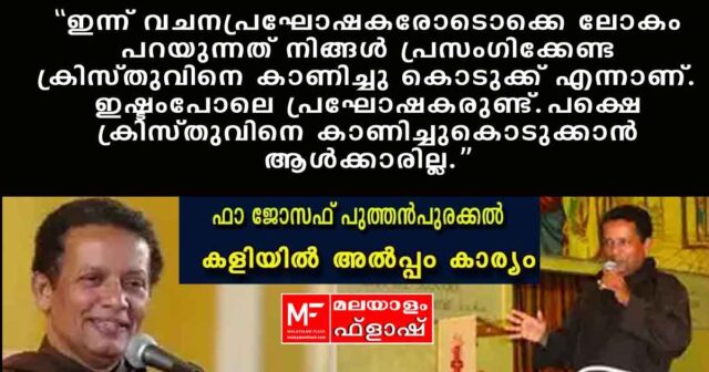 ഇന്ന് അച്ചന്മാരോട് ലോകം പറയുന്നത് എന്താണ് ? നിങ്ങൾ അധികം പറയേണ്ട ക്രിസ്തുവിനെ കാണിച്ചു കൊടുക്ക് എന്നാണ്. വചനപ്രഘോഷകരോടൊക്കെ പറയുന്നത് നിങ്ങൾ പ്രസംഗിക്കേണ്ട ക്രിസ്തുവിനെ കാണിച്ചു കൊടുക്ക് എന്നാണ് . ഇഷ്ടംപോലെ പ്രഘോഷകരുണ്ട് ഇവിടെ. പക്ഷെ ക്രിസ്തുവിനെ കാണിച്ചുകൊടുക്കാൻ ആൾക്കാരില്ല.