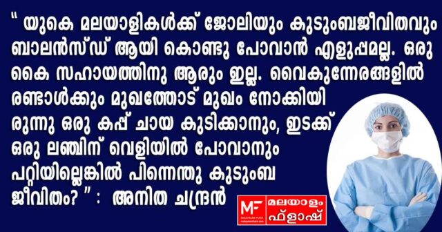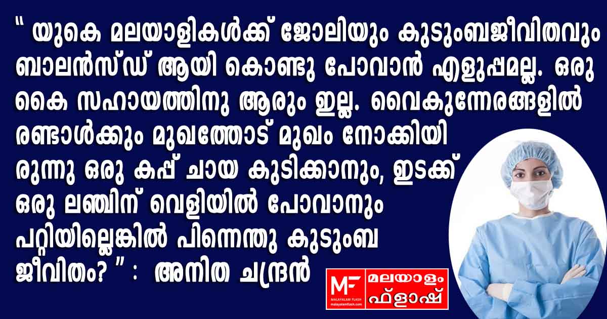 ”യു കെ മലയാളികൾക്ക് ജോലിയും കുടുംബജീവിതവും ബാലൻസ്ഡ് ആയി കൊണ്ടു പോവാൻ എളുപ്പമല്ല. രണ്ടാളും ജോലി ചെയ്യുമ്പോൾ ഒരു കൈ സഹായത്തിനു വേറെ ആരും ഇല്ല. വൈകുന്നേരങ്ങളിൽ രണ്ടാൾക്കും മുഖത്തോട് മുഖം നോക്കിയിരുന്നു ഒരു കപ്പ് ചായ കുടിക്കാനും, ഇടക്ക് ഒരു ലഞ്ചിന് വെളിയിൽ പോവാനും പറ്റിയില്ലെങ്കിൽ പിന്നെന്തു കുടുംബ ജീവിതം? ഇവിടെയുള്ള മലയാളി നഴ്സുമാരിൽ പലരും ഒരുപാട് ഓവർടൈം ജോലികൾ ചെയ്യുന്നവരാണ്. അതൊക്കെ നാട്ടിൽ വലിയ വീടുകൾ പണിതതിന്റെ കടം വീട്ടാനുമൊക്കെയാണ്. ഇതിൽ ഉള്ളിന്റെയുള്ളിൽ ഒറ്റപ്പെട്ടു പോയ, ജീവിതം മരവിച്ചു പോയ ഒരുപാട് ആളുകൾ ഉണ്ട്. നിരന്തരം ജോലി ചെയ്യുന്ന നഴ്സുമാർ. അവരുടെ മനസ്സിന് നിരാശ അല്ലാതെ മറ്റെന്താണ് കൊടുക്കാനുള്ളത്?” യു കെയിൽ ജോലിചെയ്യുന്ന മലയാളിയായ അനിത ചന്ദ്രൻ ഫേസ്ബുക്കിൽ എഴുതിയ കുറിപ്പ് ശ്രദ്ധേയമായി. കുറിപ്പിന്റെ പൂർണ്ണ രൂപം ഇങ്ങനെ :