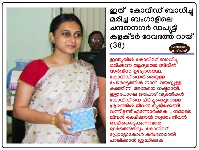 ഇന്ത്യയിൽ കോവിഡ് ബാധിച്ചു മരിക്കുന്ന ആദ്യത്തെ സിവില് സര്വീസ് ഉദ്യോഗസ്ഥ. കോവിഡിനെതിരെയുള്ള പോരാട്ടത്തിൽ നാല് വയസ്സുള്ള കുഞ്ഞിന് അമ്മയെ നഷ്ടമായി . ഇതുപോലെ ഒരുപാട് വ്യക്തികൾ, കോവിഡിനെ പിടിച്ചുകെട്ടാനുള്ള ശ്രമത്തിൽ ജീവൻ ത്യജിക്കേണ്ടി വന്നിട്ടുണ്ട് എന്നോർക്കുക . നമ്മുടെ ജീവൻ രക്ഷിക്കാൻ സ്വന്തം ജീവൻ ബലികൊടുക്കുന്നവരെ ഓർത്തെങ്കിലും കോവിഡ് പ്രോട്ടോകോൾ കർശനമായി പാലിക്കാൻ ശ്രദ്ധിക്കുക .