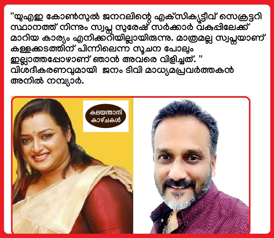 ”യുഎഇ കോൺസുൽ ജനറലിന്റെ എക്സിക്യൂട്ടീവ് സെക്രട്ടറി സ്ഥാനത്ത് നിന്നും സ്വപ്ന സുരേഷ് സർക്കാർ വകുപ്പിലേക്ക് മാറിയ കാര്യം എനിക്കറിയില്ലായിരുന്നു. മാത്രമല്ല സ്വപ്നയാണ് കള്ളക്കടത്തിന് പിന്നിലെന്ന സൂചന പോലും ഇല്ലാത്തപ്പോഴാണ് ഞാൻ അവരെ വിളിച്ചത്. ” ഫേസ്ബുക്ക് കുറിപ്പിലൂടെയാണ് അനിൽ നമ്പ്യാരുടെ പ്രതികരണം.
